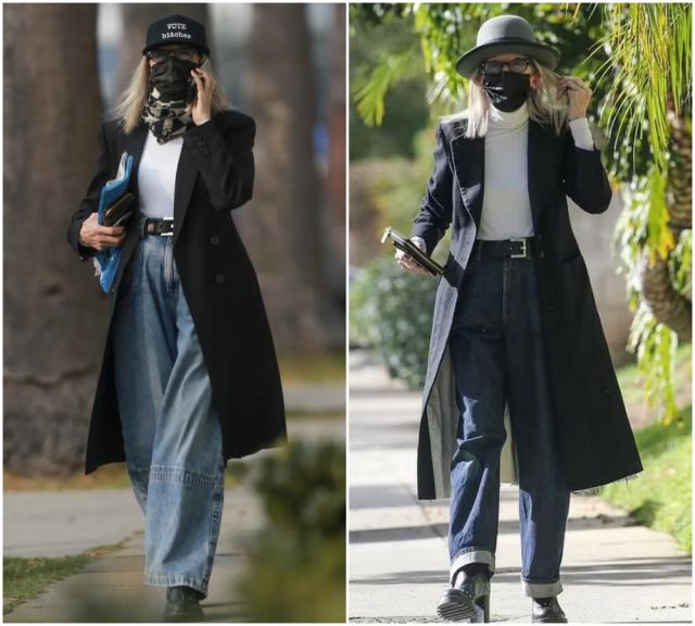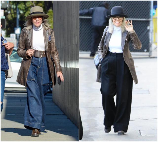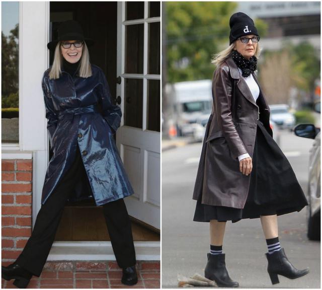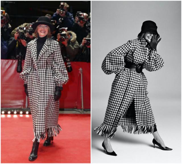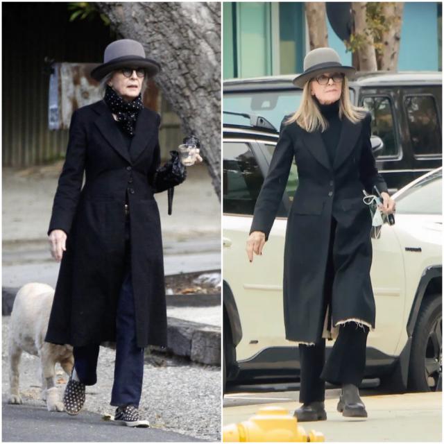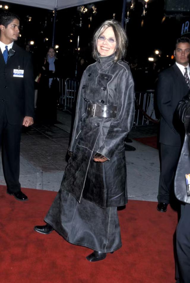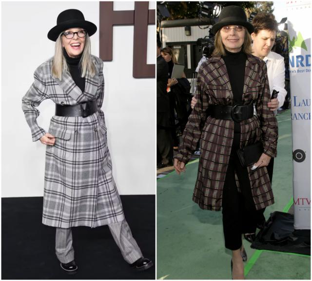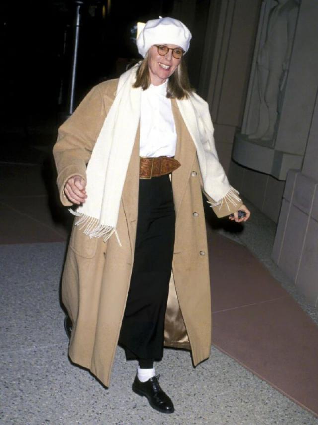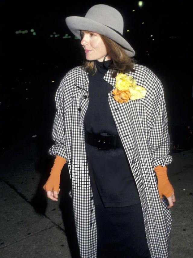 如果说西装是她的锋芒,那大衣就是她的分寸。黛安·基顿的大衣,总是松弛而气势十足。无论是羊毛呢、格纹,她穿起来都有种"我不是打扮,我就是这样"的自然感。