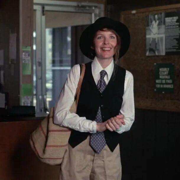很多人不知道的是,《安妮·霍尔》里的大部分造型,其实都是黛安的私服。在电影开拍前,她就已经这样穿了很多年。▼