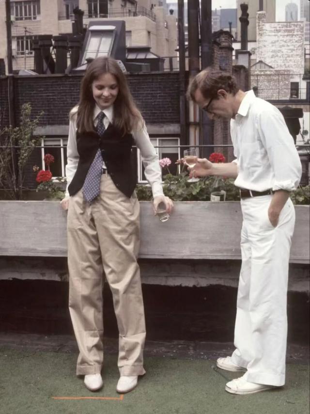 她在穿衣态度上也是如此。《安妮·霍尔》上映时是1977年,她在里穿着白衬衫、领带、马甲、宽宽大大的裤子,彻底颠覆了人们对"女主角"的想象,也跟当时70年代电影的潮流相去甚远。▼