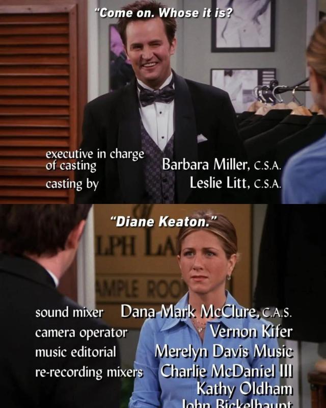 当时钱和莫在准备结婚礼服鼎宝融,原本是007西装,觉得不够酷,后来莫妮卡找来另一套,一致觉得效果很好,钱德勒问是谁的,莫妮卡说是黛安·基顿的~哈哈。▼