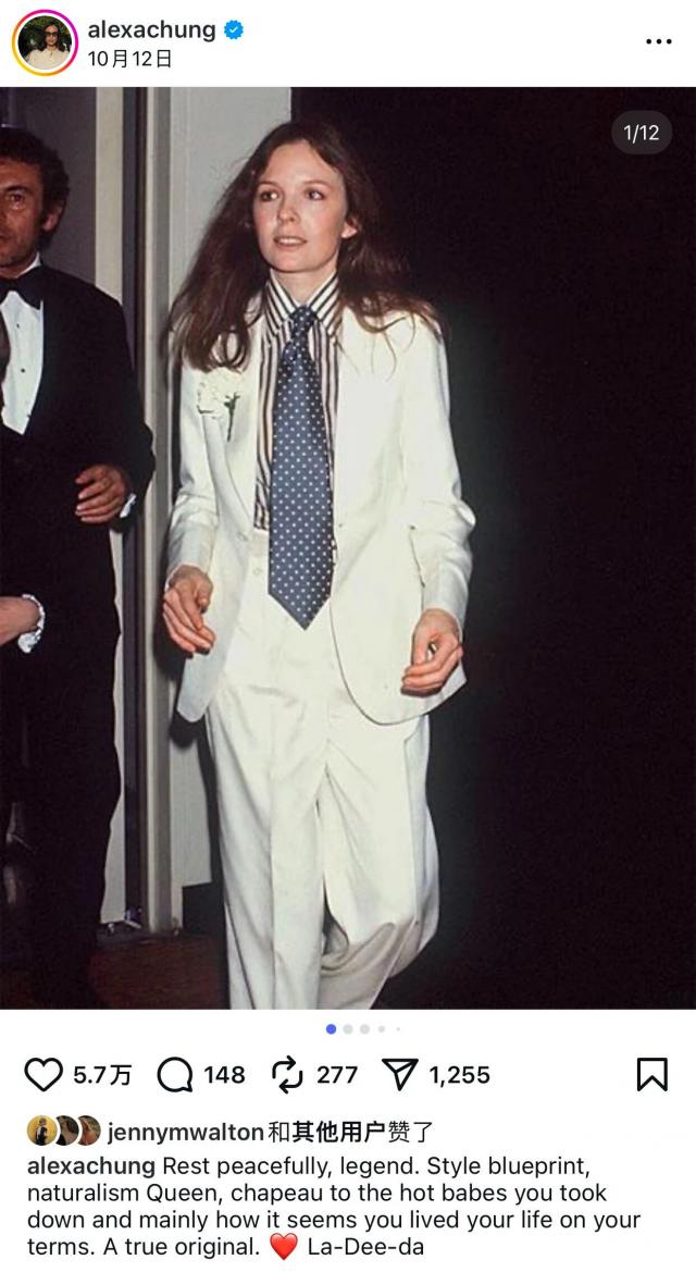 钟小姐也发了一段文字缅怀她的偶像:安息吧,传奇、风格典范、自然主义的女神。敬你是无法超越的时尚宠儿,更敬你能一直按照自己的方式生活。你是真正的开创者。爱你。▼