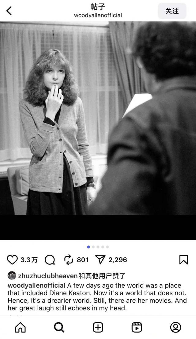 前段时间,79岁的黛安·基顿去世了,伍迪·艾伦撰文悼念她:"几天前,这个世界上拥有基顿,现在她不在了,世界也因此变得更沉闷。好在,有她的电影。她的笑声依旧回荡在我的脑海中。"▼