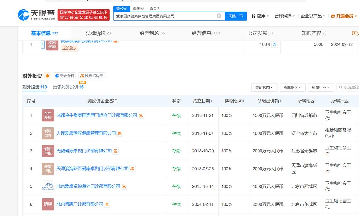 天眼查APP信息显示,到2024年11月,爱康集团在全国57大城市却仅设有173家体检、齿科与医疗中心。