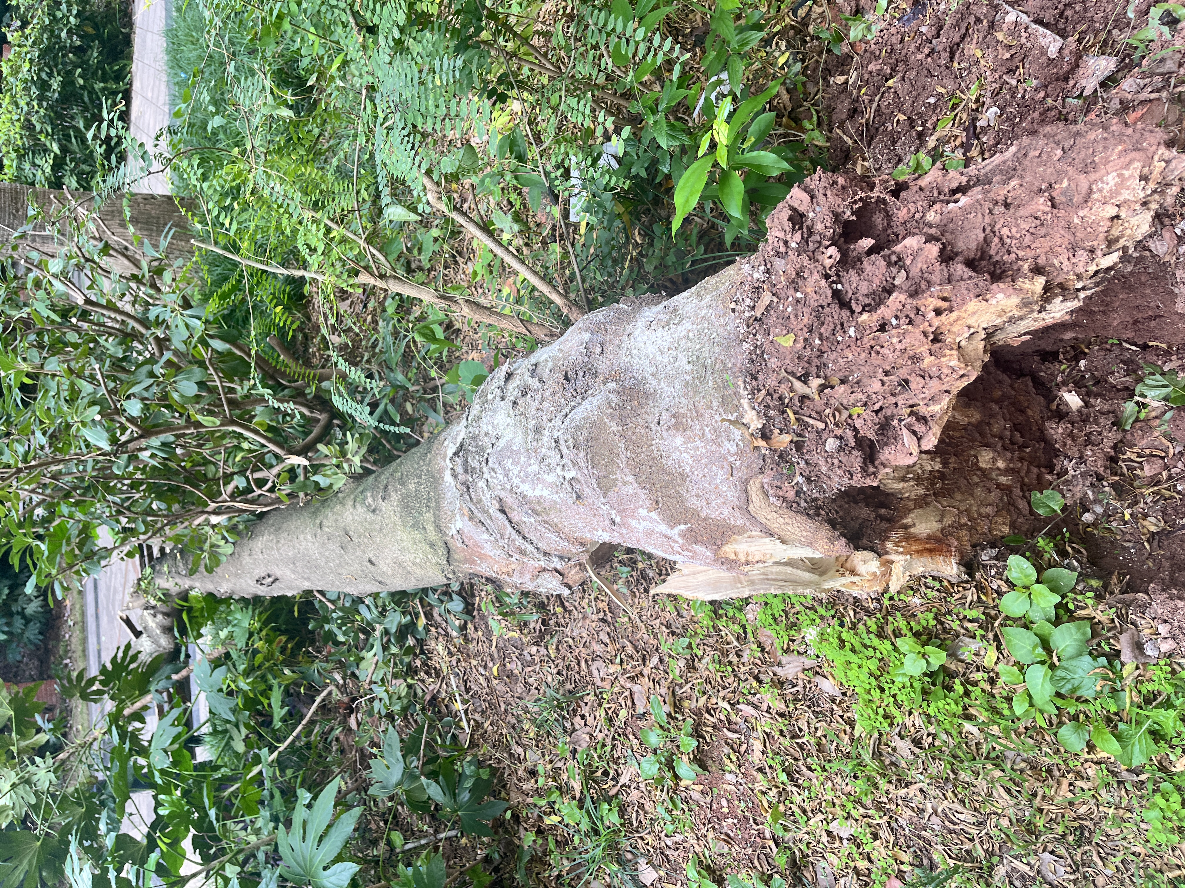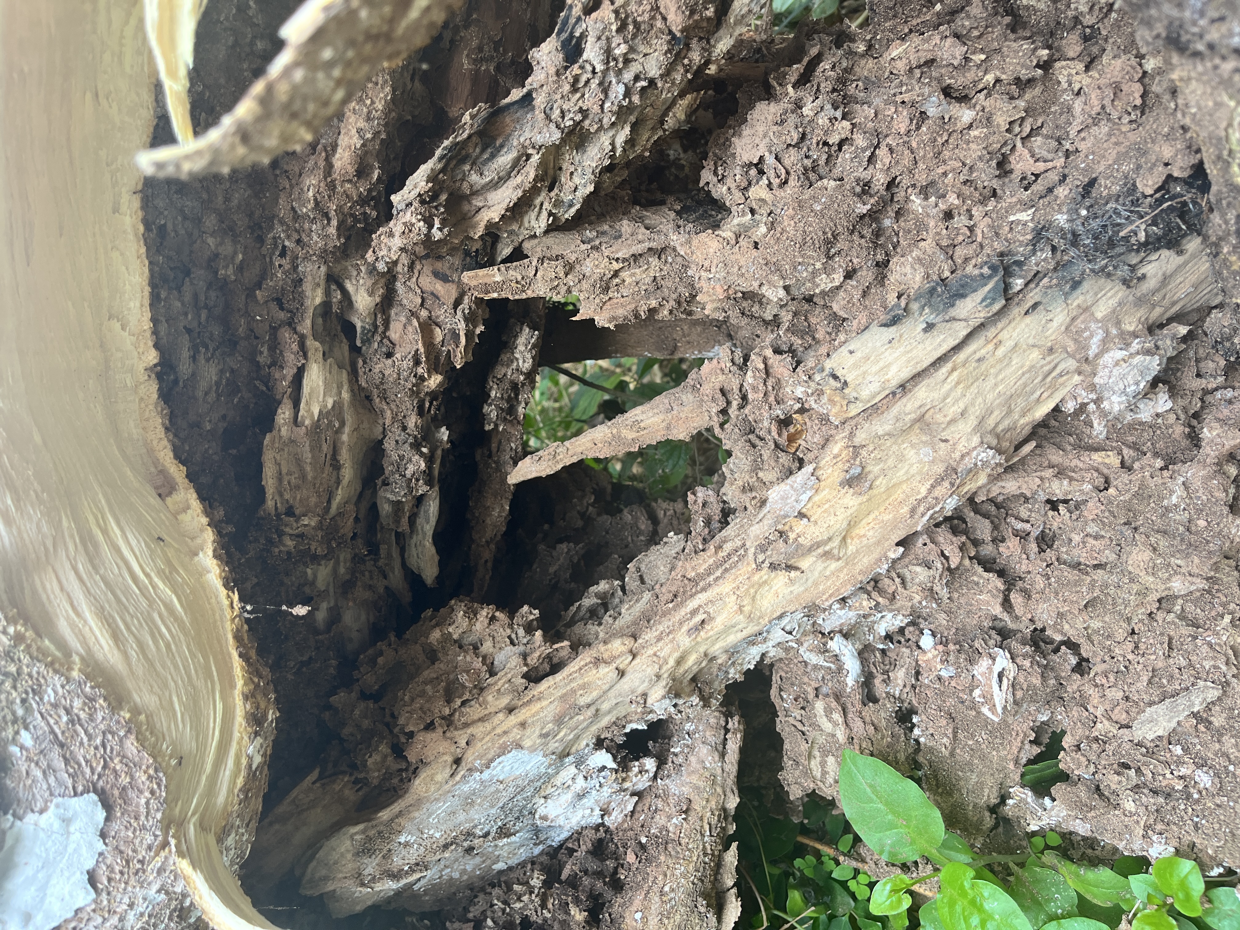 “你看白蚁把下面咬穿腐朽了,上面枝条又没修剪,头重脚轻时间一长就自然倒了。”工作人员用手指着说,在树干断裂处的内部,呈现出典型的白蚁侵蚀特征:木质部被蛀成蜂窝状,混合着白蚁活动留下的泥土,腐朽程度严重。“这棵树看着粗壮,枝繁叶茂的,但根部早被白蚁‘掏空’了。”