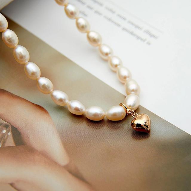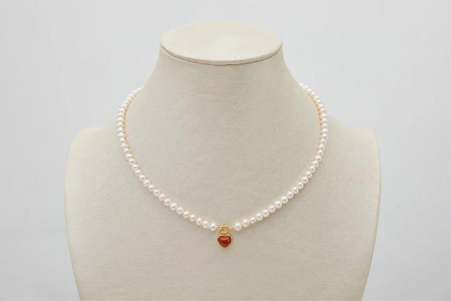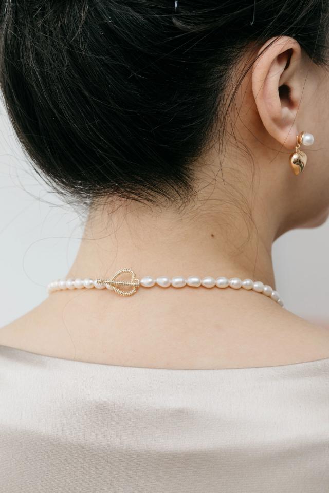 6-7mm 的小米珍珠,颗颗晶莹,品相超好,无暇光泽自带贵气。小小的桃心和它"平分秋色",作为恰到好处的点缀,搭配日常的通勤装,或者漂亮的小礼服都很漂亮。
