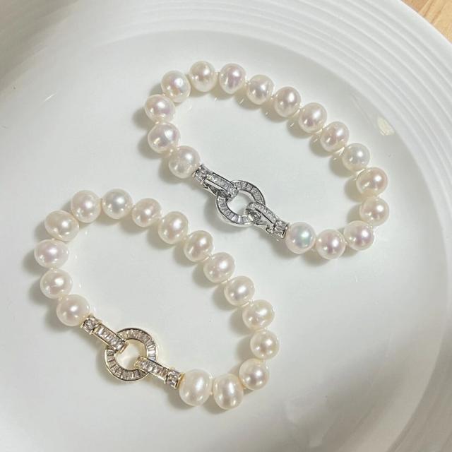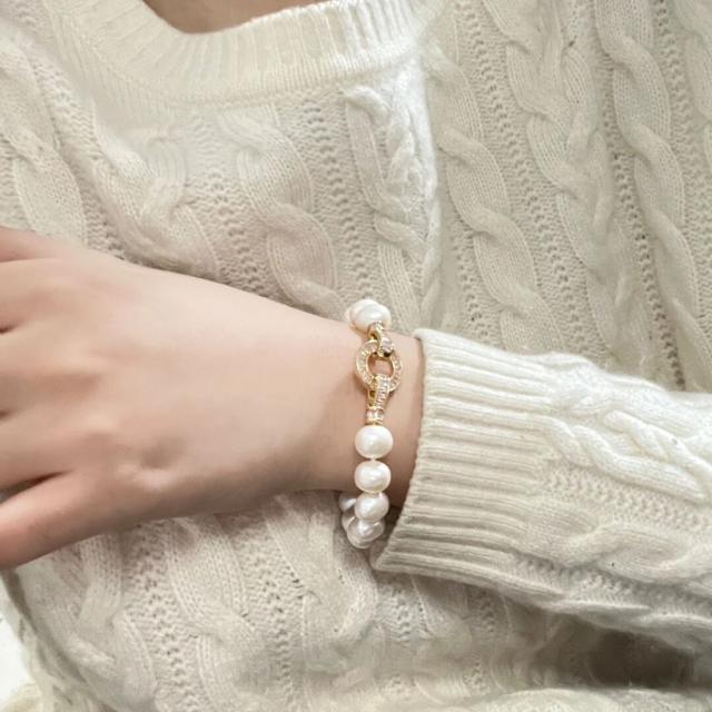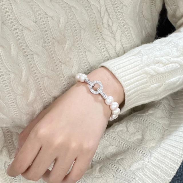 珍珠采用 9-10mm 近圆微瑕天然淡水珍珠,每颗珍珠都大小相近,色泽柔和亮丽。闪出温润又内敛的光泽感。O 字扣头的设计简洁闪耀,与整串珍珠手链相得益彰。