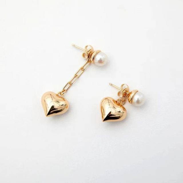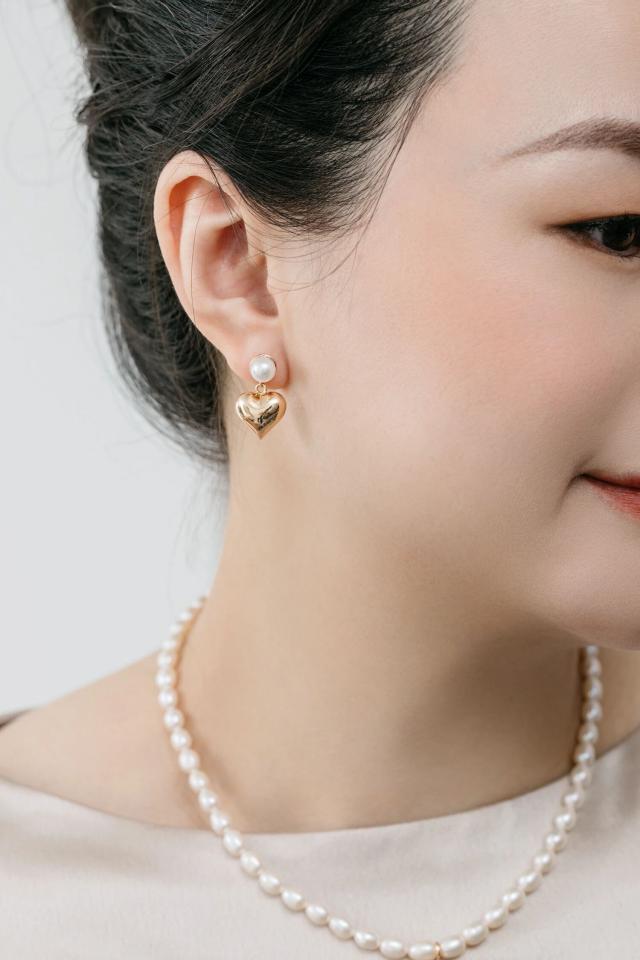 同款心形耳环,活力四射、年轻活泼。小金心珍珠耳环和上面的项链是一套,明媚又可爱,成套佩戴更显活力。