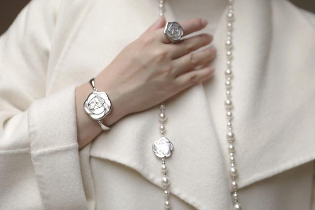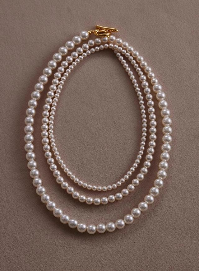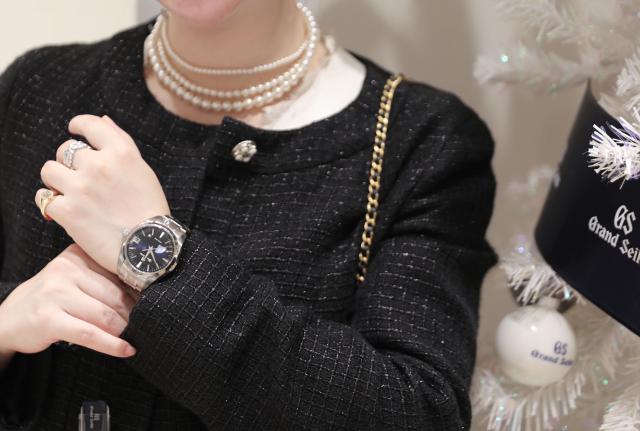 或者采用复古的三层叠戴方式,露出或不露出衔接扣都显得别有韵味。我用它搭配香奈儿斜纹软呢外套和 Seiko 腕表,项链的质感尤其显好,施华洛世奇高品质贝珠光泽感满满,还有特别的温润感,让人爱不释手。